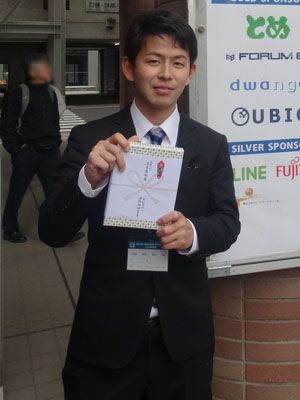 柳橋さんの受賞題目は「日本語入力手法評価のためのフレーズ集合の開発 (講演番号:4X-06)」で、文字入力手法を評価する際の入力タスクに用いる課題フレーズを生成する方法論に関する研究です。文字の出現頻度やフレーズ長を考慮して課題フレーズを自動生成する手法を提案しその評価を行いました。研究内容と発表における質疑応答等が総合的に高く評価されての受賞となりました。柳橋さんは「この様な賞を頂けたことを大変嬉しく思います。本研究に協力して下さった皆様あっての受賞だと思っています。心より感謝申し上げます。」と述べています。